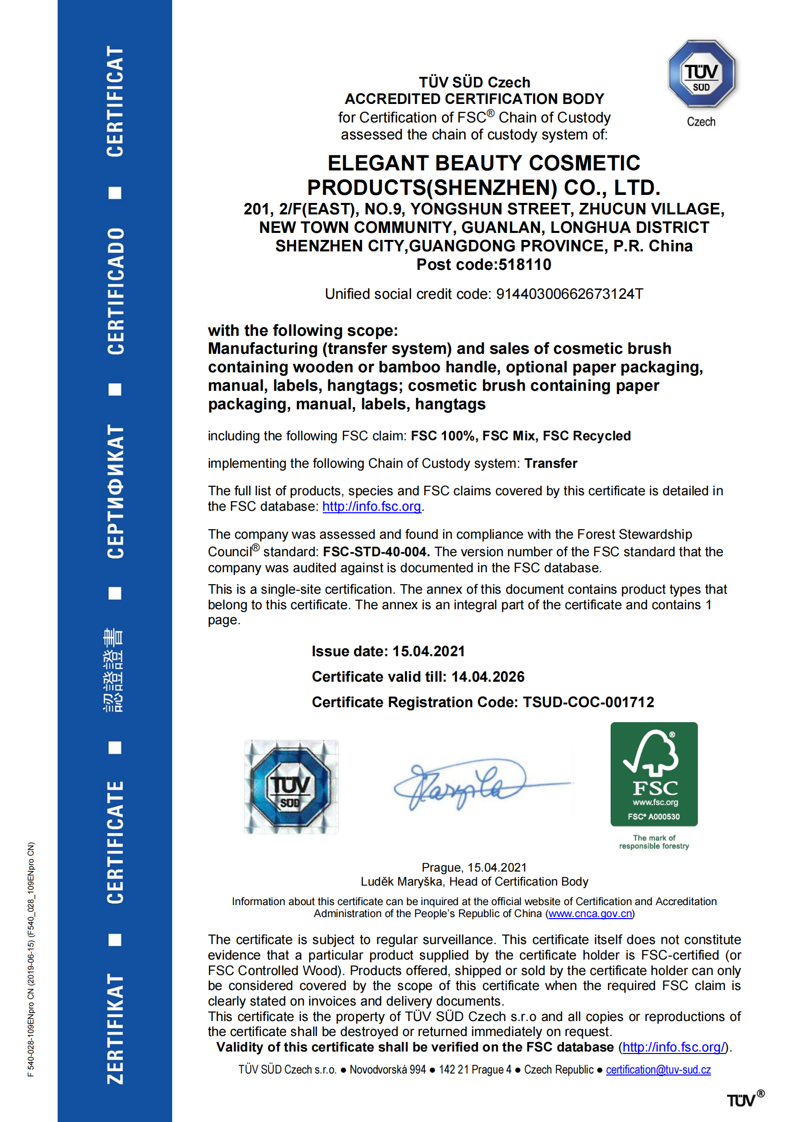 熱烈慶祝雅香麗化妝用品(深圳)有限公司--榮獲FSC產(chǎn)銷監(jiān)管鏈認(rèn)證證書