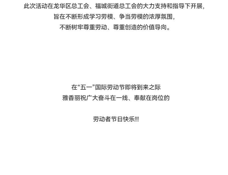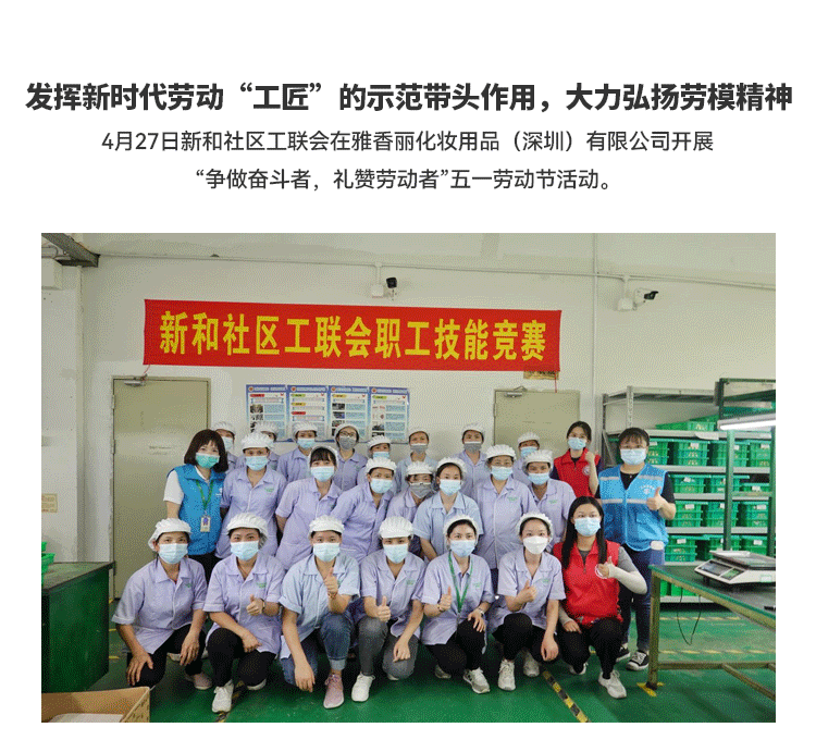 發(fā)揮新時(shí)代勞動(dòng)"工匠"的示范帶頭作用,大力弘揚(yáng)勞模精神;新和社區(qū)工聯(lián)會在雅香麗化妝用品(深圳)有限公司開展 “爭做奮斗者,禮贊勞動(dòng)者”五一勞動(dòng)節(jié)活動(dòng)。